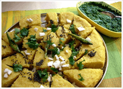 Garnish the besan dhokla with coriander and slited green chilies.